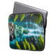 Uma estátua Tranquil Bodha sentada ao lado de uma cachoeira que flui.