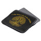 Uma figura Buda serena ouro senta-se debaixo de uma árvore intricadamente desenhada com galhos giratórios.