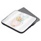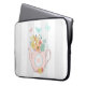 Bolsa de laptop com uma ilustração química. Um bule cor-de-rosa com um pequeno coração cor-de-rosa no centro e um buquê de flores. Delicar borboletas coloridas com sabor a flecha. Colocado sobre uma cinza e fundo listrado branco.