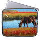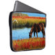 Bebendo marrom bonito do cavalo selvagem de um lago azul com um tapete colorido da grama no fundo e em um vôo da gaivota. Cenário surpreendente da natureza.
