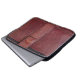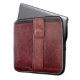Proteja seu laptop com uma luva feita sob encomenda do neopreno com um olhar autêntico. A parte dianteira da luva caracteriza uma imagem de couro marrom gasto com uma correia de couro e um fecho. (A luva tem um zipper real para fixar seus índices mas nenhum couro é usado). A parte traseira da luva é preta.