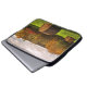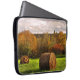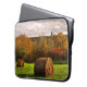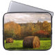 Esta bolsa de laptop da fotografia das belas artes apresenta uma paisagem bonita do outono em cores sazonais do folhagem de outono de vermelho, de alaranjado, de amarelo, de marrom e de verde. Uma tempestade passou e o sol está quebrando através das nuvens em um campo segado com os pacotes redondos do feno.