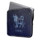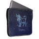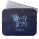 Bolsa de laptop com o símbolo de Taurus em azul-prateado suave, sobreposta com as estrelas da constelação, sobre um fundo céu estrelado formando de azul-da-meia-noite a preto