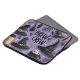 Esta ilustração gráfica esbranquiçada e texturizada apresenta um padrão ocupado de chapéus de bruxa preta, canecas de café a vapor e várias folhagens sobre um fundo roxo lavanda. O texto "BREW TRW" está centrado, combinando um tema de Halloween e café.