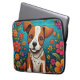 Arte aérea branca adorável com um cachorrinho castanho e branco rodeado por flores de arte folclórica, cor-de-rosa, laranja e roxo.