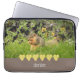 Este design de caixa de laptop apresenta uma fotografia de um esquilo fofo na grama em frente a picos pretos e amarelos. Há também corações de mão amarela acima de uma área para personalizar com seu nome.