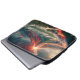 Uma majestosa erupção vulcânica domina a cena, com lava vermelha vibrante fluindo pelas encostas e uma pluma de fumaça soprando para o céu. A paisagem circundante está repleta de verde, contrastando a erupção feroz.