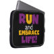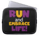 Se você gosta de correr, correr 5Ks, 10Ks, meia maratona, ou maratonas, você vai adorar este design de texto colorido em roxo e amarelo que lê Run and Embrace Life! Corra e Abraça Camisas de Vida, capuzes, ímãs, botões, cartões, adesivos, correntes-chave e muitos outros itens para corredores que adoram um design brilhante e colorido!