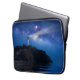 Esta incrível foto do Getty Images apresenta um farol em uma ilha no meio do mar à noite com muitas estrelas e a Via Látea.