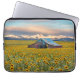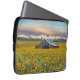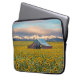 Esta incrível foto do Getty Images apresenta um campo de girassóis crescendo ao redor de um velho celeiro dilapidado com montanhas de neve no fundo.