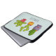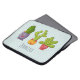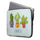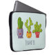 Bolsa de laptop com uma ilustração esbranquiçada com 3 pequenos cactos felizes sentados em seus próprios potes de flores. Cada um deles tem suas próprias expressões únicas sorrindo e parecendo feliz. Um fundo verde de menta com bolinhas.