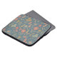 Esta bolsa de laptop apresenta flores estilizadas em tons de coral e verde-oliva sobre fundo azul-denim.