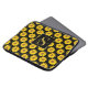 Um padrão de girassóis amarelos brilhantes sobre fundo preto com um monograma preto e dourado.