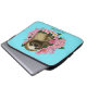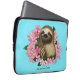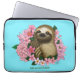 Uma preguiça bonita sentada entre flores cor-de-rosa contra um pano de fundo azul.
