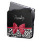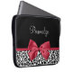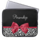 Personalize acrescentando o nome de qualquer menina feminina a essa bolsa de laptop de neoprene preto e branco, de 15'', com uma fita vermelha brilhante e bonita presa a um arco de na moda. Este design de impressão em forma de animais é uma imagem impressa em formato plano e não contém fita real.