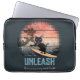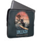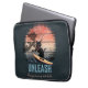 Bolsa de laptop de Gato Sunset Onda-Onda: Um gato preto surfando em uma onda, com o pôr do sol em tons de rosa e laranja, criando uma cena balística e surreal.
