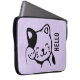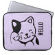 Uma bolsa de laptop com a palavra: Olá e desenhado com uma ilustração de um gatinho sorridente e balançando com um ponto preto ao redor do seu ouvido. Fundo bolinhas roxo. Simples e adorável.