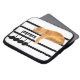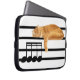 Tabuleiro laranja comprido por gatinho snoozes nas linhas de funcionarios de uma música particionada e bolsa de laptop de amantes de gatos