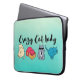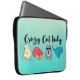 Uma bolsa de laptop com as palavras: "Senhora Louca de Gato" escrita numa letra de moda. 4 gatos bonitos abaixo do texto. Cada gato tem uma personalidade única. Um é um gato legal com óculos de sol e uma gravata, outro é um gato sonolento, um é um gato olhando, e um é um gato brincalhão arranhado numa caixa que parece pronto para pular. Coloque um pano de fundo verde colorido.