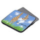 Uma girafa bonita a espreitar por cima com margarida branca na boca sobre o fundo do céu. O texto pode ser editado ou excluído.