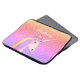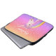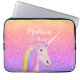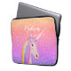 A Bolsa de laptop Perigosa do Arco-Íris Cor-de-Rosa Personalizada faz uma bela ideia de presente para um amante de unicórnio. Ele é projetado com um fundo de falso arco-íris. Uma bonito face branca de unicórnio está no centro e ela tem cabelo pastel arco-íris e flores em cima de sua cabeça. Personalizado com o nome em letras brancas de script na área superior.