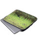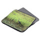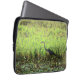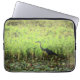 Uma fotografia de um Herão Azul Excelente caminhando através de um lago. A superfície do lago está coberta de lírios de água. A lagoa está rodeada de pedúnculos de plantas verdes, que está perto de um campo. Fotografia Copyright ©2021 Kimberly J Tilley.