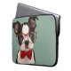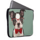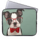 Ilustração bonito de um filhote de cachorro do terrier de Boston do estilo do hipster que veste vidros do olho e o laço vermelho chique no fundo azul. Projetado por Maryline Cazenave.