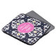 Um presente que pode ser personalizado com seu círculo dentro cor-de-rosa monograma no centro. O plano de fundo é azul marinho e o padrão branco do ikat.