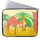 Esta região apresenta 2 camelos no deserto perto de algumas palmeiras.