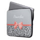 Um impressão animal na moda a bolsa de laptop de 15 polegadas com um teste padrão cinzento feminino do jaguar embellished com uma fita coral bonito amarrada em um arco. Personalize esta caixa do desenhista das mulheres adicionando seu nome. Imagem impressa do plano, fita nao real.
