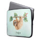 Bolsa de laptop com uma preguiça adorável pendurada de cabeça para baixo de um galho de árvore. Ramo de árvore é decorado com folhas e bagas tropicais. Colocado sobre um fundo verde-claro.
