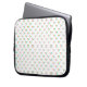 Laptop sleeve with a minimalist design featuring diagonal stripes in green, red, and blue on a white background. A laptop is partially visible, tucked inside.