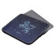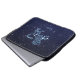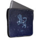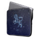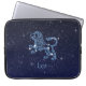 Bolsa de laptop com o símbolo de Leo em azul-prata suave, sobreposta com as estrelas da constelação, sobre um fundo do céu estrelado formando de azul-da-meia-noite a preto