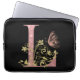 Bonito brilho inicial/letra L, cor-de-rosa, com folhas e espirais douradas e cobertura de borboletas em fundo preto