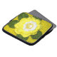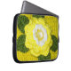 A imagem floral amarela e verde impressa no saco de eletrônicos é de uma foto de uma criação original feita em crochê projetada à mão e Copyright © pelo designer publicado Delores Chamblin. A fotografia da única flor artesanal e das folhas com pontos visíveis e com um botão cor de pérola é reproduzida na viagem.