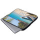 Uma bolsa de laptop com uma cena tropical idílica. Água clara de cristal azul turquesa e uma praia arenosa castanha macia. Algumas folhas de palma penduradas de cima. Um velho barco a remo de madeira fica sentado na praia. Uma paisagem serena e pacífica.