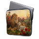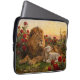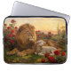 A majestic lion and a gentle lamb are resting peacefully in a lush rose garden. The scene is depicted with the rich texture and soft lighting of a classical oil painting.