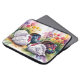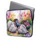 A vibrant, horizontal illustration rendered in a loose watercolor style, featuring a group of four turkeys in a lush field of flowers. Two of the turkeys are traditional white with prominent red wattles, sitting in the foreground. The two background turkeys are stylized with vivid, unnatural colors, displaying deep blues, purples, and rainbow feathers. The background is filled with brightly colored, painterly wildflowers and a soft, blending sky of pinks, yellows, and purples, giving the whole image a cheerful, celebratory, and festive look ideal for autumn or Thanksgiving.