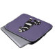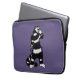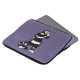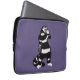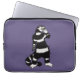 Bolsa de laptop de gato assustador com desenho de tinta representando um estranho gatinho listrado preto e branco com pescoço longo segurando uma máscara de crânio. Parece que uma de suas luvas está fora e sua mão esquelética mostra de sua manga. Pergunto-me se é muito mais uma criatura assustadora do que finge estar no Halloween.