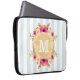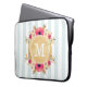 Bolsa de laptop com padrão listrado de menta, flores cor-de-água rosa e monograma personalizado de folha de ouro falsa.