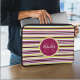 Esta bolsa de laptop feminina moderna apresenta um padrão listrado colorido em branco, amarelo, rosa e roxo com um nome personalizado e monograma em cores compatíveis.