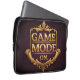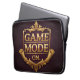 O design apresenta a frase "Game Mode On" em uma fonte dourada estilizada, maiúscula. As palavras são postas contra um rico pano de fundo vermelho veludo, com sutis destaques dourados para um ar de opulência e grandiosidade.