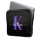 Esta simples e elegante bolsa de laptop preta de 13" com seu primeiro nome em uma letra de script de tendência em branco e sua primeira inicial em uma fonte moderna de boné em roxo é perfeita para você. É na moda e moda e, no entanto, muito clássico. É único, como você!