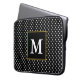 Um grande monograma branco é um quadrado preto com borda falsa de ouro. Bolinhas brancas estão nesta bolsa de laptop preta.