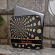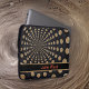 Esta bolsa de laptop apresenta um design de lua girada por abstrato, com uma banda personalizável para o nosso nome ou iniciais. Esta design lunar inclui uma banda a preto com uma borda contrastante, e o seu nome ou iniciais a vermelho.