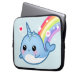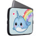 Proteja o seu laptop com esta manga super fofa e durável. Há três tamanhos disponíveis para você escolher. Esta design apresenta um narval de bebê kawaii com arco-íris, estrelas cintilantes e corações sobre fundo azul-bebê.