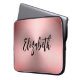 Esta bolsa de laptop rosa tem um aspecto de metal escovado. O texto de exibição é um script preto que você pode editar para mostrar um nome ou uma mensagem personalizada.