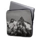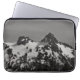 Uma fotografia a preto e branco de dois picos na Faixa Tatoosh conhecida como O Castelo e o Pinnacle. A cordilheira está coberta de neve apesar de ser verão. Há árvores e pedras espalhadas sobre a paisagem e as montanhas. A posição do sol permite que sombras sejam lançadas na montanha. As nuvens incógnitas adoram o céu. Imagem Copyright ©2023 Kimberly J Tilley. zazzle.com/store/developingnature