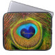 Uma bolsa de laptop 15 polegadas com uma fotografia impressionante do close up de um coração vibrante e bonito deu forma aos olhos azuis de uma pena de pássaro lindo do pavão de turquesa e de ouro. Personalize adicionando seu nome. Aperfeiçoe a maneira para que os amantes do pássaro digam: Eu amo pavões!
