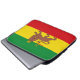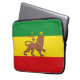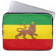 A laptop sleeve with a historical flag of Ethiopia; red, golden and green horizontal stripes with Lion of Judah with a crown and spear in the center; used from 1897 to 1974